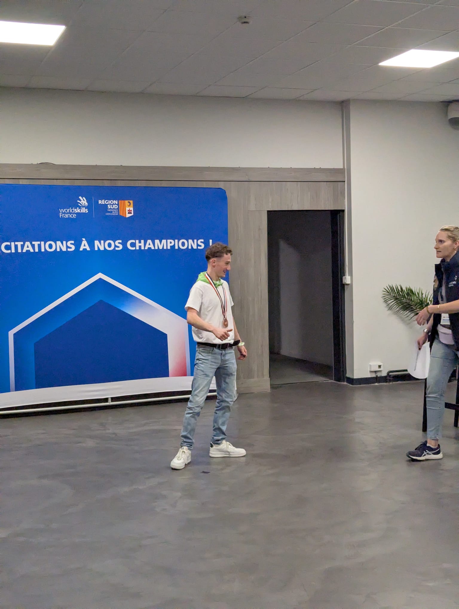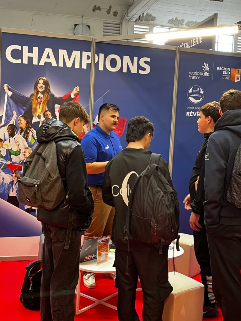 Baptiste Girault qui représentait la France à la finale internationale de Lyon 2024 était avec nous pour échanger avec les jeunes. Beaucoup de questions lui ont été posées notamment sur les œuvres des éditions précédentes de la compétition exposées sur le stand.